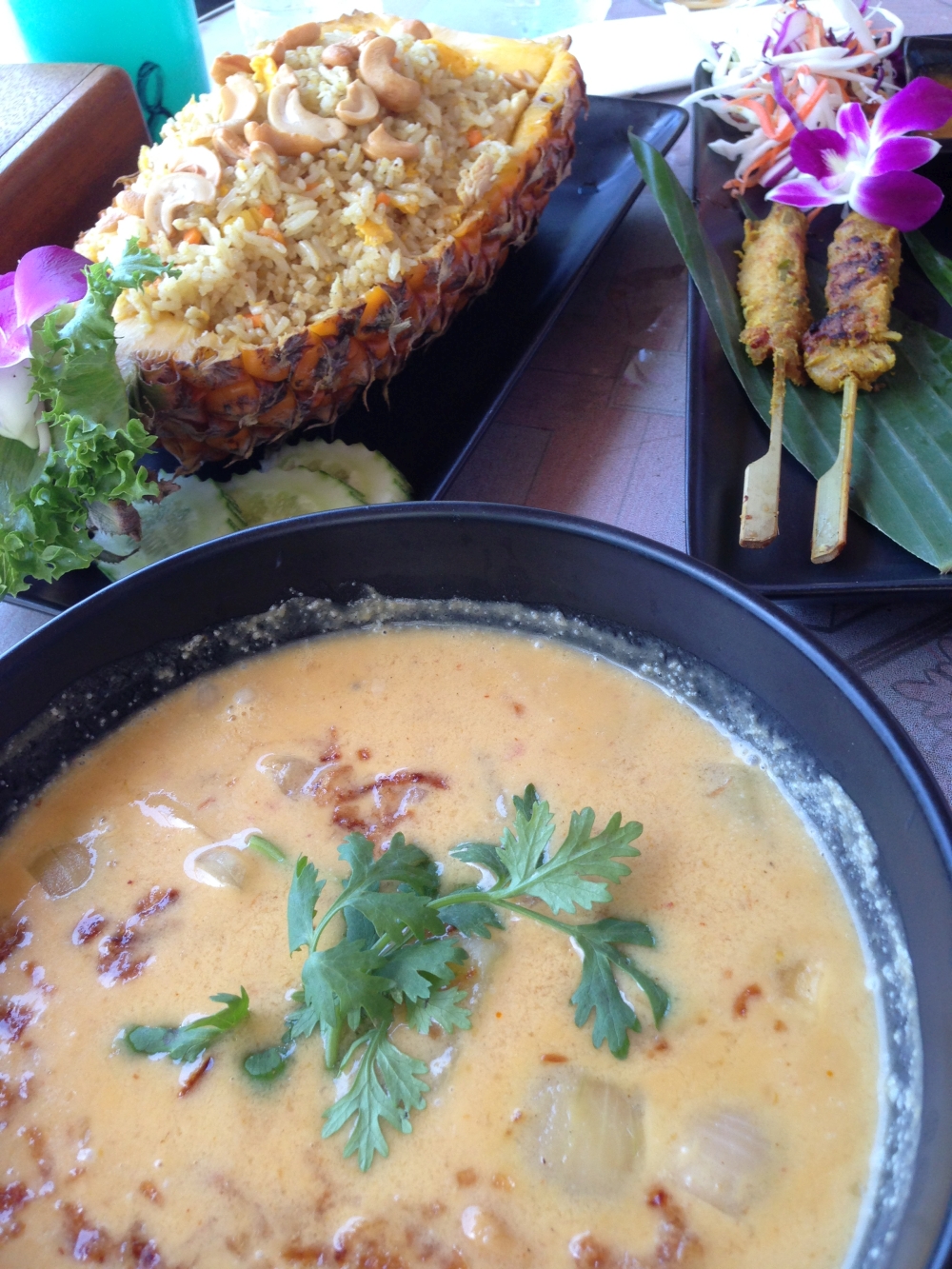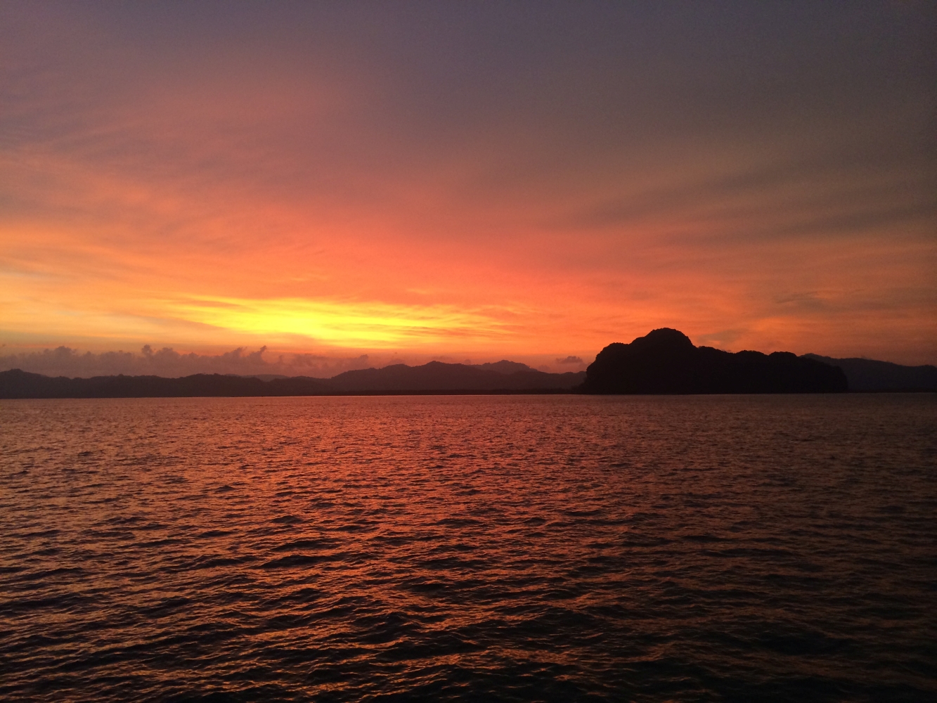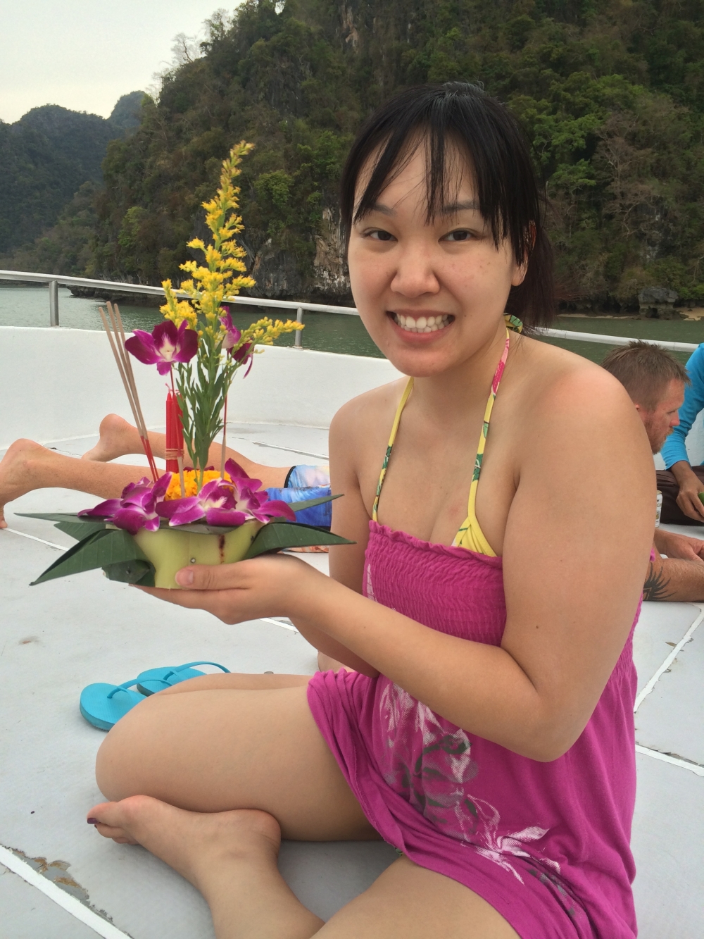 So erforschten wir einige „Hongs“, mit gelegentlichen Pausen auf dem großen Boot, wo es ausreichend Essen und Trinken gab. Abends zeigten uns die Fischer (die übrigens alle null Englisch konnten) wie Thailänder Opfergaben zusammenstecken und dekorieren. Wir nutzten Bananenbaumholz, Palmenblätter, Blumen, Nägel, Kerzen und Räucherstäbchen um ein kleines Kunstwerk zu erstellen. Währenddessen konnten wir einen intensiven, farbenfrohen Sonnenuntergang erleben. Der Himmel verwandelte sich innerhalb von 30 Minuten von einem satten blau, in knallgelb, intensives orange, und von blutrot in einen klaren, schwarzen Sternenhimmel.