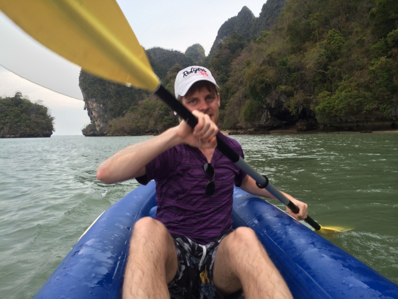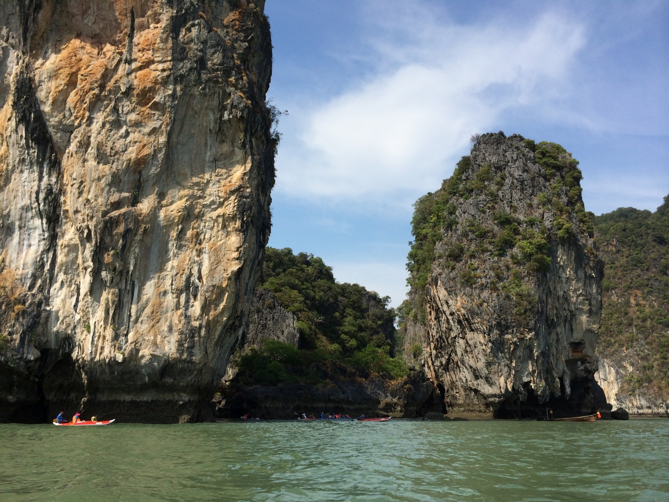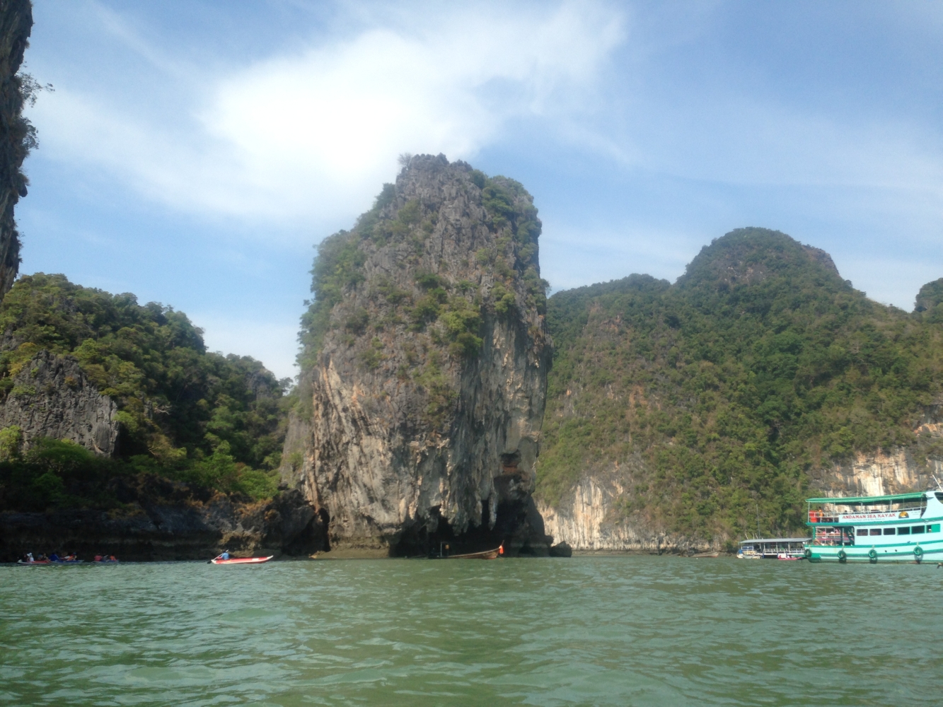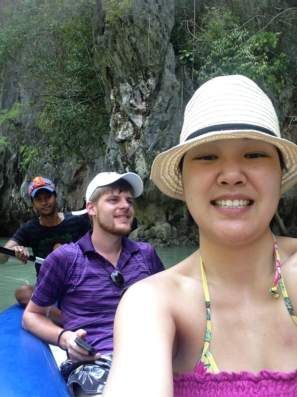 Der letzte Tag in Thailand war mit Abstand der schönste. Diesen verbrachten wir auf dem Wasser mit einer Kayaking-Tour. Zusammen mit ca. 30 anderen Touristen stachen wir morgens früh mit einem zweistöckigen Kutter in See. Nach ca. zwei Stunden waren wir dann am Ziel: Die „Hongs“; kleine und sehr steile Felseninseln mitten im Meer, für die die Gegend berühmt ist. Das Highlight war, dass wir bei Ebbe mit Kayaks (geleitet von erfahrenen Fischern) sogar einige Höhlen durchpaddeln konnten. In der Mitte einiger Inseln hatten sich Lichtungen gebildet, die man nur durch Navigation einer sehr engen Höhle erreichen kann. Bei Flut gibt es hier keinen Ausgang. An allen Seiten steile Felswände, aber in der Mitte wunderschöne Natur und Wildlife. Atemberaubend…