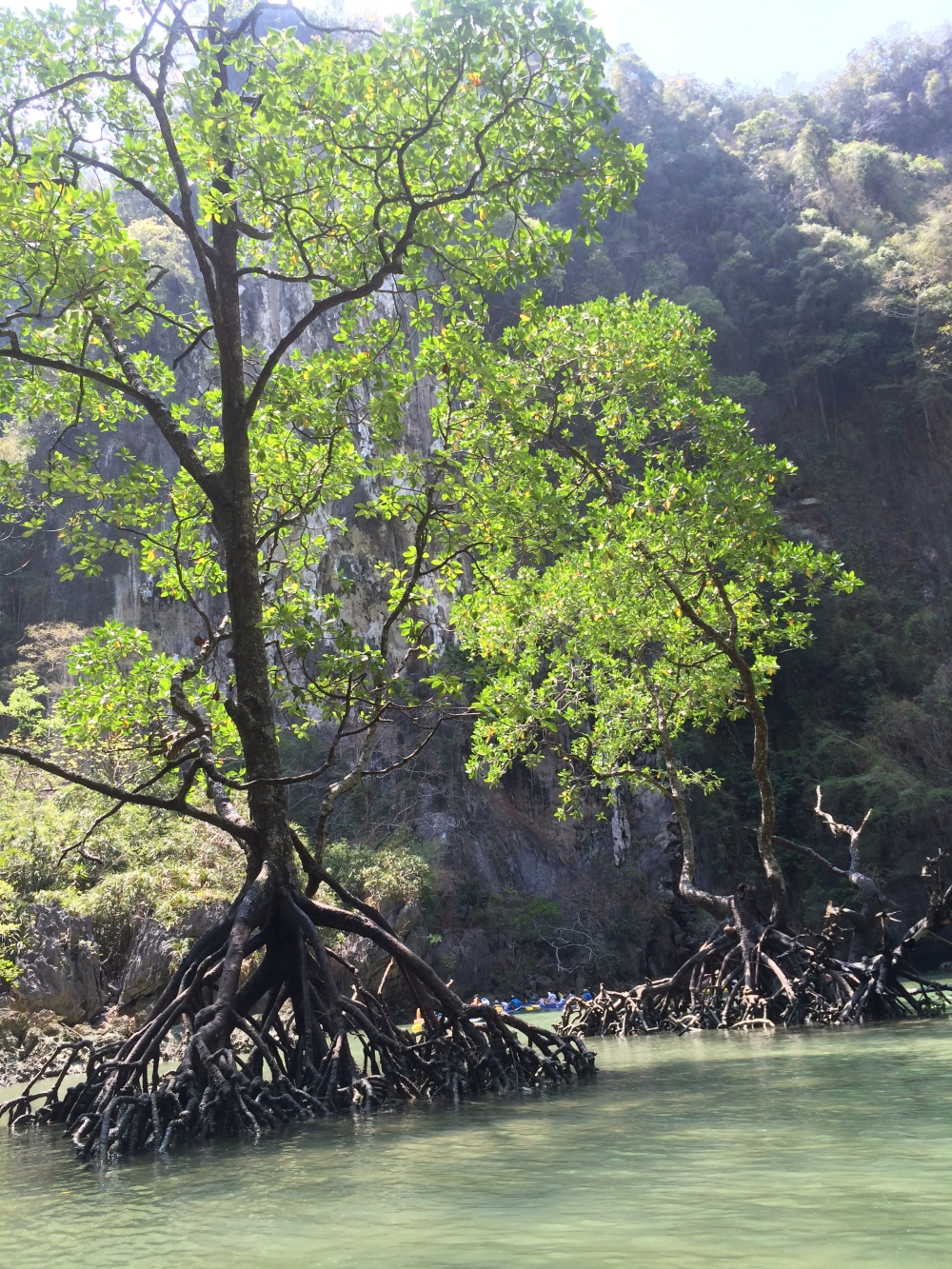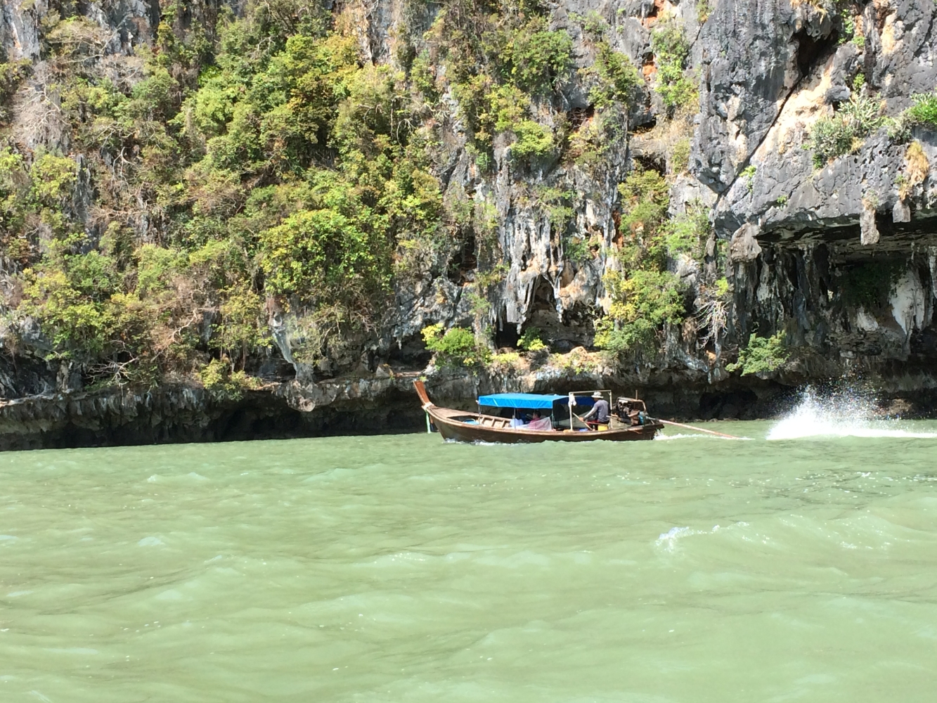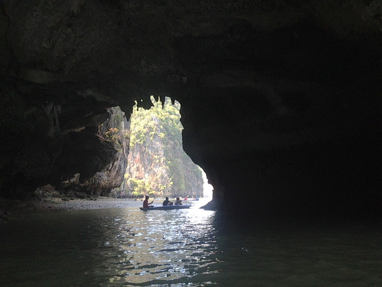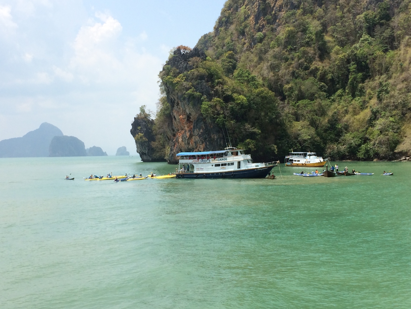 Der letzte Tag in Thailand war mit Abstand der schönste. Diesen verbrachten wir auf dem Wasser mit einer Kayaking-Tour. Zusammen mit ca. 30 anderen Touristen stachen wir morgens früh mit einem zweistöckigen Kutter in See. Nach ca. zwei Stunden waren wir dann am Ziel: Die „Hongs“; kleine und sehr steile Felseninseln mitten im Meer, für die die Gegend berühmt ist. Das Highlight war, dass wir bei Ebbe mit Kayaks (geleitet von erfahrenen Fischern) sogar einige Höhlen durchpaddeln konnten. In der Mitte einiger Inseln hatten sich Lichtungen gebildet, die man nur durch Navigation einer sehr engen Höhle erreichen kann. Bei Flut gibt es hier keinen Ausgang. An allen Seiten steile Felswände, aber in der Mitte wunderschöne Natur und Wildlife. Atemberaubend…