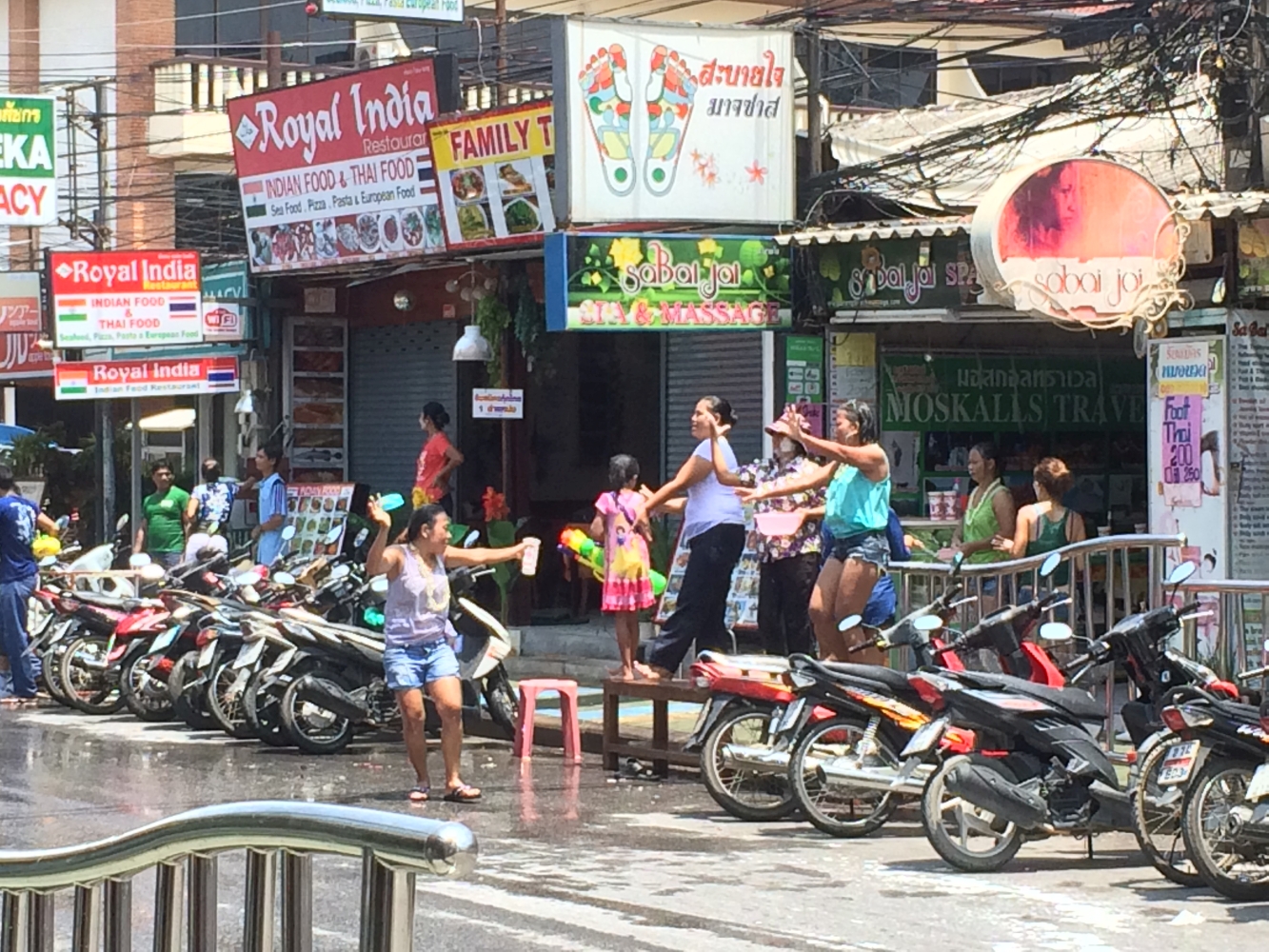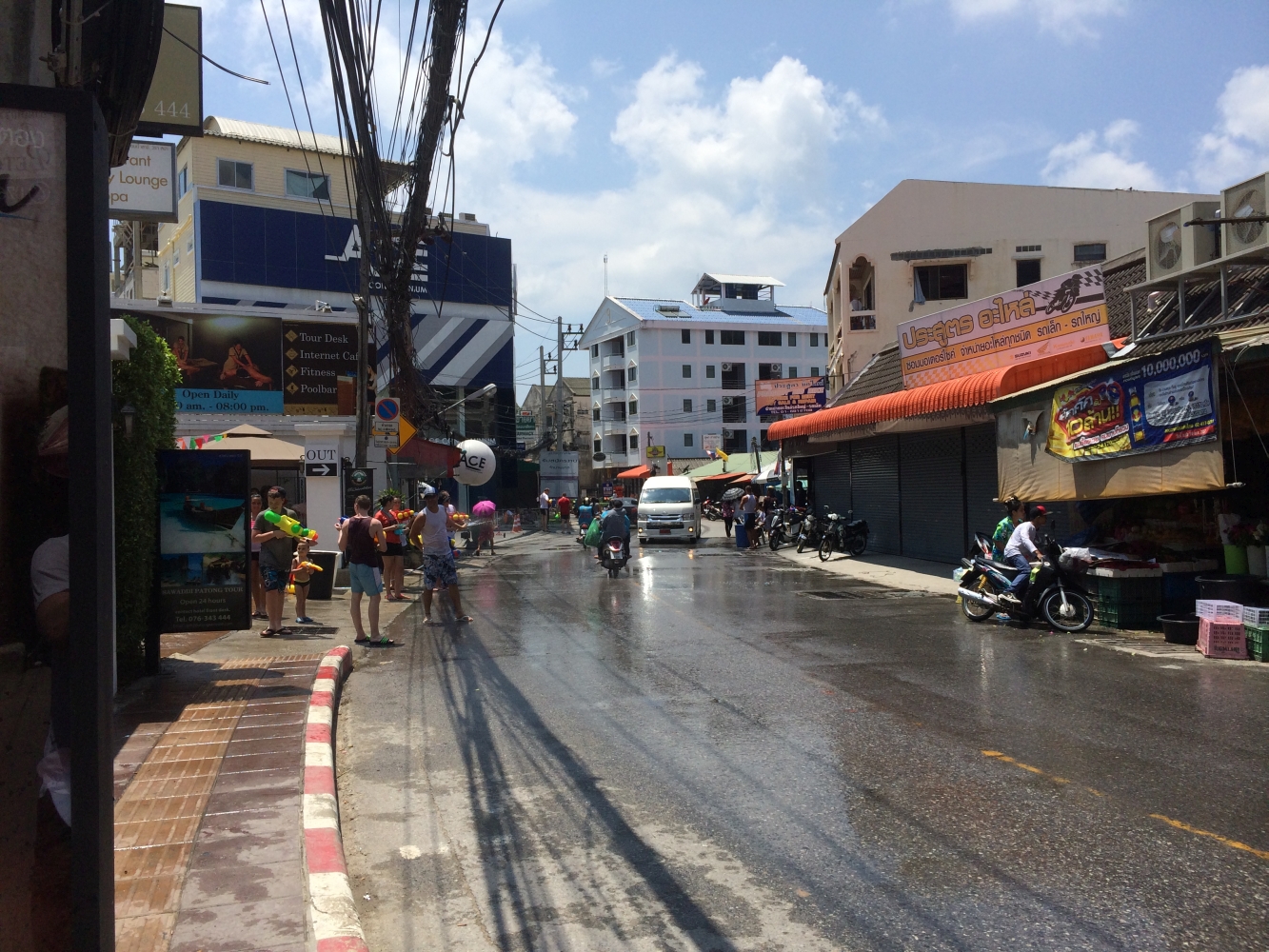 Am Zielflughafen wurden wir wie erwartet von gefühlten tausend Leuten wie Schmeißfliegen belagert, die uns „cheap taxi, best taxi“ anbieten wollten. Glücklicherweise hatten wir uns informiert und bahnten uns durch die Menge zu den offiziellen und zuverlässigen Taxis. So kamen wir unversehrt und halbwegs günstig zu unserem 60min-entfernten Hotel am Patong Beach, dem Touristenzentrum der Insel. Auf dem Weg erklärte uns unser Taxifahrer in gebrochenem Englisch, dass wir an einem tollen Tag angekommen seien. Und zwar am „Songkran“, der Tag des traditionellen Neujahrsfestes nach dem thailändischen Mondkalender. Teil der Tradition ist das Zusammenkommen der ganzen Familie sowie das Begießen von Buddha-Figuren mit heiligem Wasser. Wie wir allerdings sehr schnell herausfanden haben sich die rituellen Waschungen im Laufe der Geschichte dahingehend entwickelt, dass sich zu Songkran alle Personen einfach nur gegenseitig mit Wasser übergießen und bespritzen. Dieser Brauch wird vor allem in Phuket exzessiv betrieben und es entstehen auf den Straßen spontan regelrechte Umzüge von offenen Wagen, auf denen Feiernde gefüllte Wassertonnen transportieren, um Wasserpistolen, Eimer und Flaschen immer wieder nachzufüllen. Und das nicht nur in einem einzigen Stadtteil, sondern auf der ganzen Insel, bzw. im ganzen Land. So entkommt man kaum den Wasserschlachten die sich an jeder Ecke abspielen. Entsprechend waren wir nach nur wenigen Minuten klitschnass. Glücklicherweise spielt das Wetter mit und es war nicht allzu unangenehm nass herumzulaufen. Doch die Stimmung war so aggressiv, entmächtigend und überfordernd, dass wir nach einigen Stunden frustiert (und nass) aufgaben und den Rest des Tages am Hotelpool verbrachten.