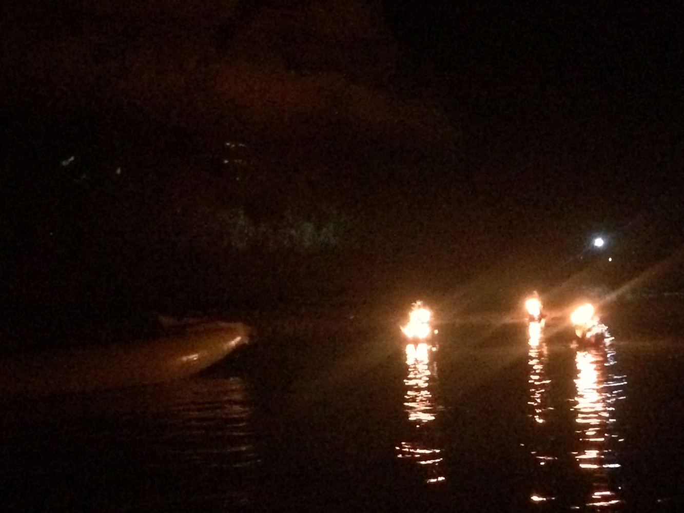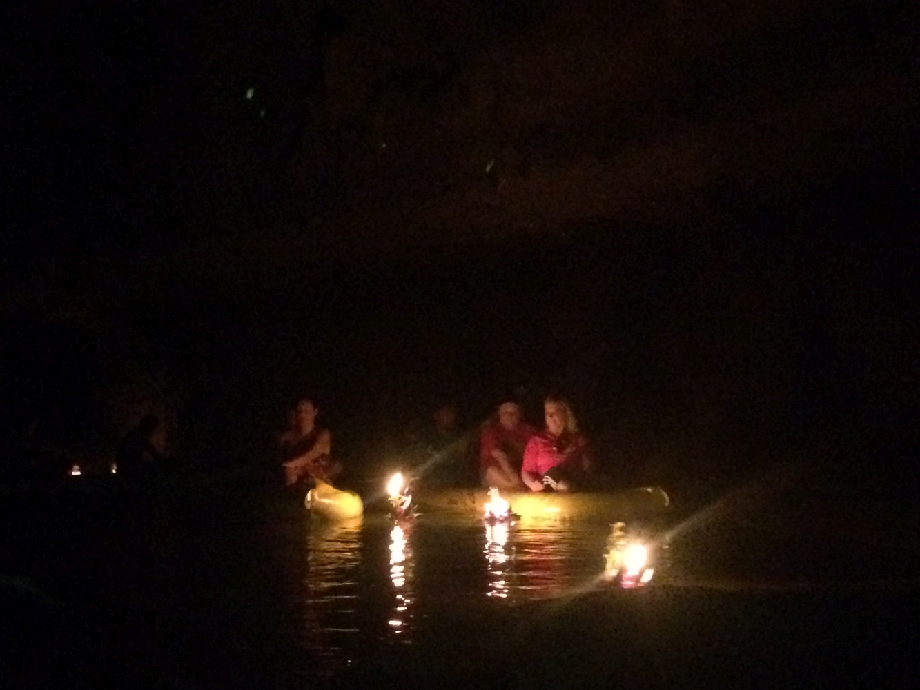 Mit unseren Opfergaben ging es dann bei Nacht noch einmal mit den Kayaks in eine der Höhlen, von wo aus wir die Kerzen entzündeten und die Opfergaben ins Wasser gleiten ließen. Es enstand ein Meer aus Reflektionen und Lichterspielen das einen in seinen Bann zog. Unter der Wasserobfläche machten zudem fluoriszierende Algen mit und so ergab sich ein Bild bzw. eine Stimmung die sich mit keiner Kamera oder Worten festhalten lässt. In solchen Momenten ist der Geist komplett frei von Sorgen und Alltagsstress. Man denkt sich: Wer brauch schon Strom, Handy und Internet, wenn man solch ein Naturschauspiel genießen kann…